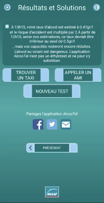 Penting untuk diingat bahwa hasil yang diberikan oleh AlcooTel bersifat indikatif. Tujuan utama aplikasi ini, yang diinisiasi oleh Prévention MAAF, adalah untuk meningkatkan kesadaran publik dan memberikan informasi penting mengenai bahaya mengemudi dalam pengaruh alkohol. Dengan AlcooTel, kami berharap setiap individu dapat membuat pilihan yang cerdas demi keamanan diri sendiri dan orang lain di jalan.