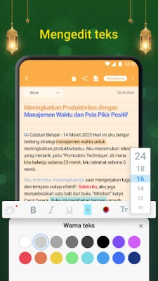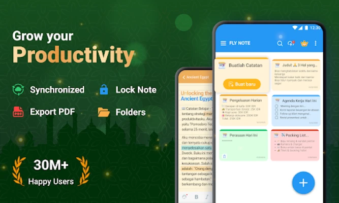 Dipercaya oleh lebih dari 30 juta pengguna di seluruh dunia, FlyNote menawarkan serangkaian fitur andal yang dirancang untuk mendukung gaya hidup modern. Akses cepat catatan penting langsung dari layar utama perangkat Anda berkat widget praktis. Privasi Anda selalu terjaga dengan opsi penguncian catatan menggunakan kata sandi, sementara sinkronisasi aman melalui Google Drive menjamin aksesibilitas catatan Anda kapan saja, di mana saja, tanpa khawatir kehilangan data. Personalisasi pengalaman mencatat Anda dengan beragam tema dan warna, lalu atur tenggat waktu dengan pengingat cerdas yang tidak akan pernah Anda lewatkan. Fitur lain seperti pintasan cepat, pemulihan catatan terhapus, dan ekspor ke PDF, semakin melengkapi kemudahan yang ditawarkan FlyNote.