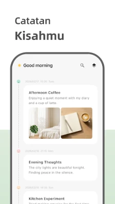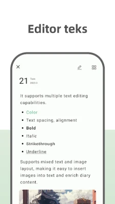 Aplikasi ini memberdayakan Anda untuk menjadi arsitek jurnal Anda sendiri. Bebaskan kreativitas dengan kemampuan menyatukan teks dan gambar, mendesain tata letak yang menarik untuk setiap entri. Sesuaikan setiap detail tulisan, mulai dari jarak baris, jarak huruf, hingga warna dan ukuran font, untuk menciptakan gaya jurnal yang benar-benar Anda. Fitur lini masa yang dapat dipersonalisasi memudahkan Anda menelusuri catatan, sementara tag dan templat khusus memungkinkan pengorganisasian yang rapi dan penulisan yang efisien, menghindari pengulangan.