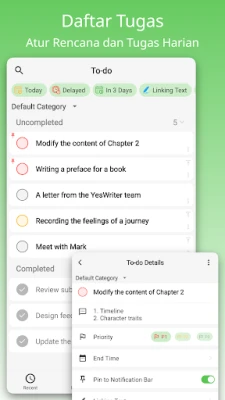 Tingkatkan produktivitas Anda dengan manajemen tugas terintegrasi YesWriter. Buat daftar tugas, tetapkan prioritas, dan tentukan tenggat waktu agar tidak ada hal penting yang terlewat. Bahkan, Anda bisa menyematkan pengingat langsung di bilah notifikasi sistem untuk fokus pada prioritas utama. Keamanan data Anda adalah prioritas YesWriter; dengan dukungan pencadangan otomatis ke Google Drive, semua karya Anda terlindungi dari risiko kehilangan. Untuk privasi ekstra, lindungi buku, catatan, atau folder tertentu dengan kata sandi, menjaga kerahasiaan ide-ide sensitif. Nikmati pengalaman menulis bebas gangguan berkat antarmuka YesWriter yang bersih, elegan, dan bebas iklan, lengkap dengan mode gelap untuk kenyamanan mata Anda. YesWriter adalah solusi serbaguna yang menanti untuk mengoptimalkan potensi penulisan dan organisasi Anda.